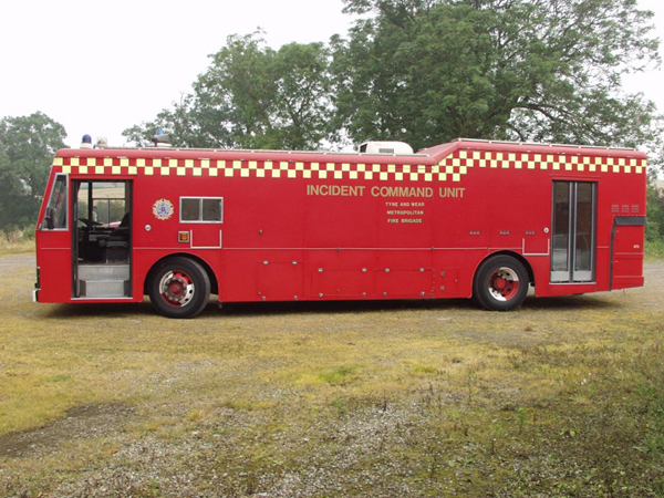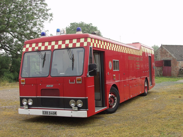EBB846W is the Incident Command Unit of the Tyne and Wear Metropolitan Fire Brigade which came 'Off the run' in September 2002 and carried the call sign of A(0)7. It is based on a Dennis Dominator bus chassis with the body supplied by Angloco in 1980. The chassis was originally conceived for double deck bus applications but also did appear in single deck configuration. It is fitted with a 6 cylinder Gardner engine with a Voith Gearbox driving through a Dennis differential.