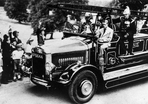 BPB644 is the original Dennis factory Big 4 demonstrator. It was built in 1931 with the D3 side valve engine rather than the later OHV engine. When it was with the factory it was painted green with a blue bonnet and 'extra chrome' was specified on the Works Production Order. The locker handles have 'Dennis' cast into them and it is believed to be the only known occurrence of such items. The photograph shows the Prince of Wales having a test drive in 1934. In 1936 this machine was sold to Long Eaton Fire Brigade in Derbyshire, where it saw considerable war time action (See below!).
