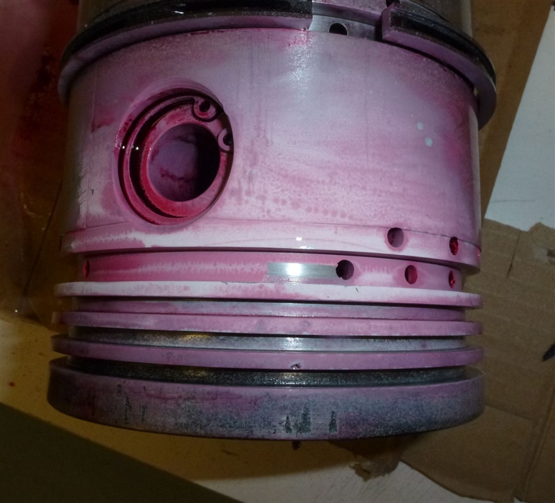 Number 4 piston was pulled out yet again, cleaned and then sprayed with dye penetrant. When the developer was applied it was apparent that a crack in the piston existed just above the oil ring. Although not an obvious source for such a pronounced clank replacing this piston seemed an obvious way forward.