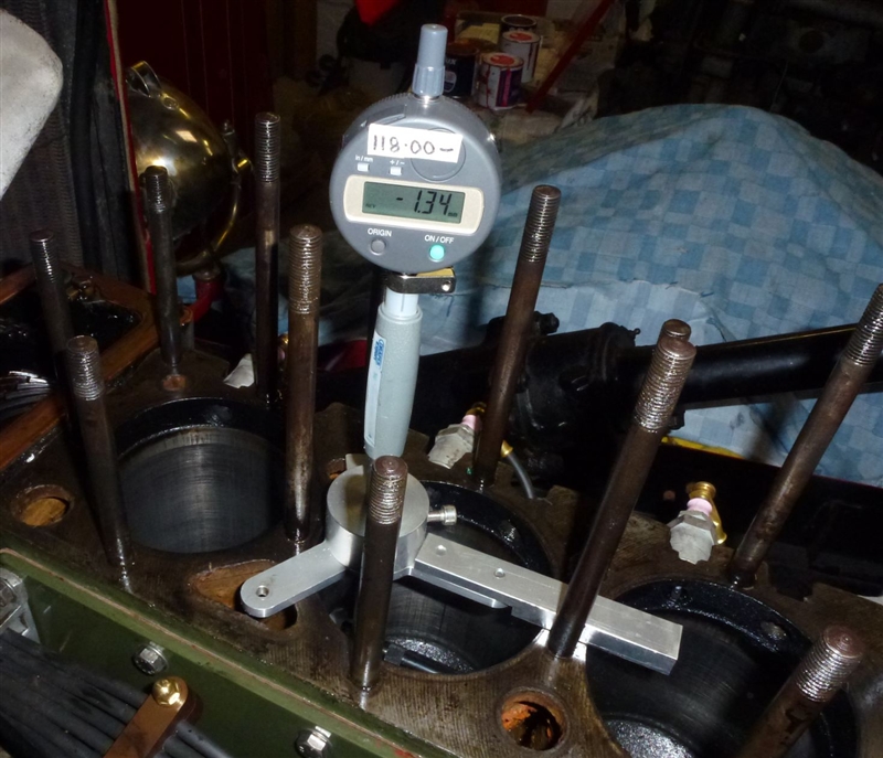 The problem being however was that a only a +040" replacement piston was not available when a +030" was required. It was decided to turn down the only available piston to the correct size. Before doing this an accurate assessment of bore size was required. to do this a bore gauge was used. Although bore gauges ae designed to be hand held a great deal of skill and experience are required to achieve repeatable and accurate measurements. A jig was therefore made to hold the bore gauge square to the bores. Bore gauges work in a subtractive mode. Rods are assembled in an additive mode to the next bore mm oversize (in this case 118mm) and the dial gauge records the amount to be subtracted. In this case the bore size is 116.66mm.