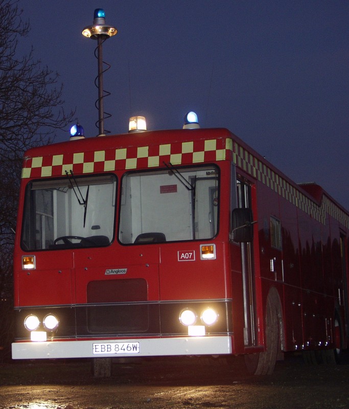EBB846W is the Incident Command Unit of the Tyne and Wear Metropolitan Fire Brigade which came 'Off the run' in September 2002 and carried the call sign of A(0)7. It is based on a Dennis Dominator bus chassis with the body supplied by Angloco in 1980. The chassis was originally conceived for double deck bus applications but also did appear in single deck configuration. It is fitted with a 6 cylinder Gardner engine with a Voith Gearbox driving through a Dennis differential.