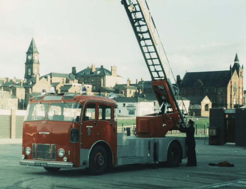 In this picture we see the Firemaster in the yard of Darlington Fire Station with the clock tower of Bank Top railway station in the background.