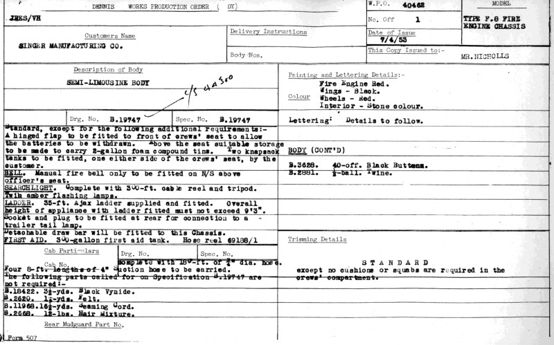 The Works Production Order (or the WPO) is the most important document in the creation of a new Dennis Fire Appliance. Below is shown the WPO for 'Disney'. Since no cushions or squabs were required in the crews' compartment, the material content in this machine could be reduced by;