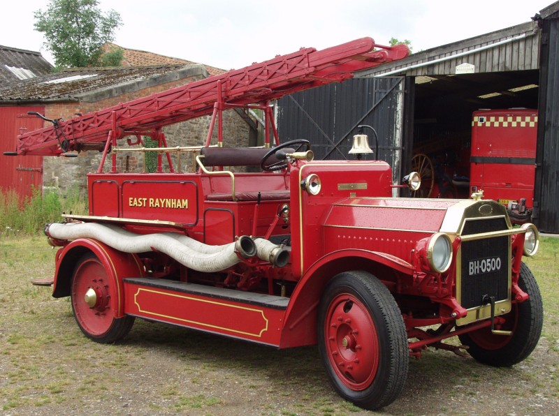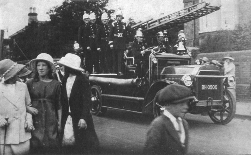 This photograph taken sometime in the 1920's shows BH-0500 taking part in a local parade. At this stage in its life it is still fitted with the original solid tyred cast spoked wheels. A standard pattern Ajax type ladder is also carried.