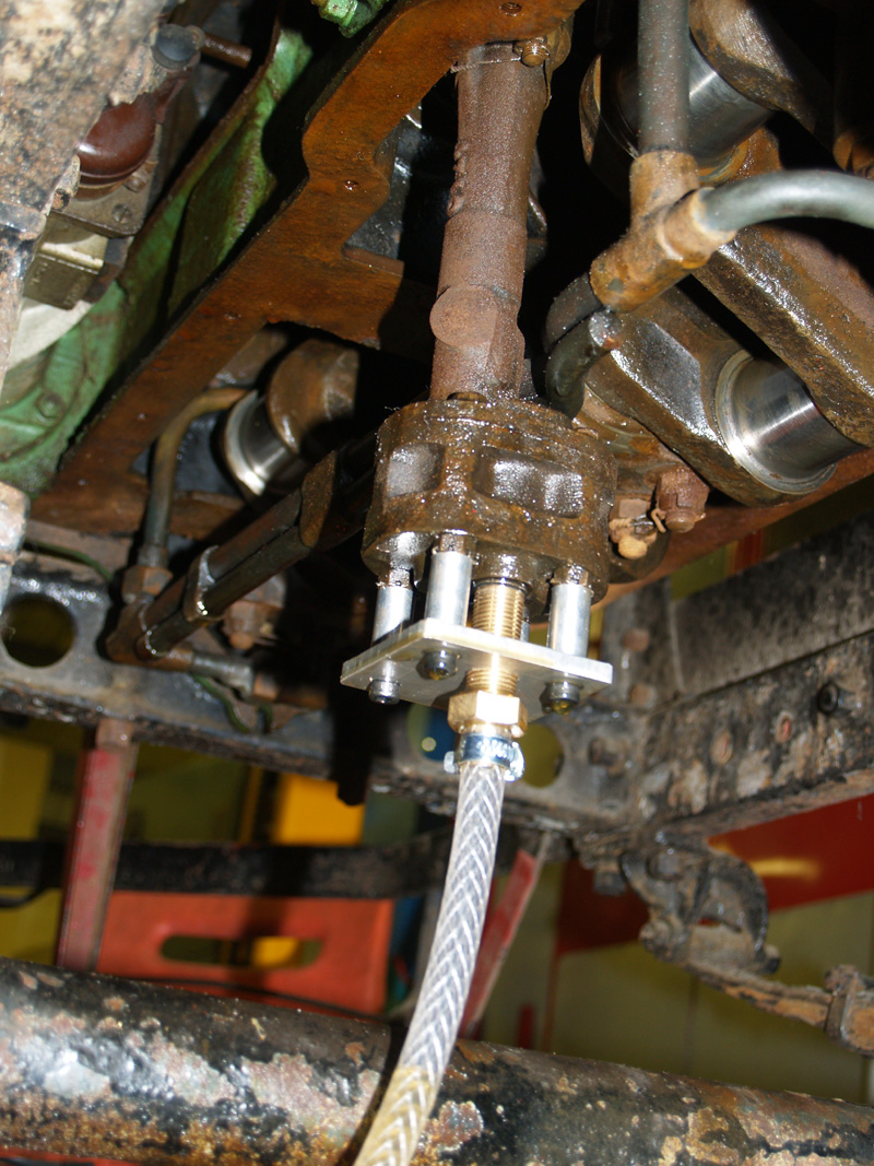 Here we see the connection to the oil pump. With oil dripping out of all the right places the engine was rotated with the starting handle. After a few swings the crank rotated very smoothly and would continue to rotate under the momentum of the flywheel for two or three additional revolutions.
