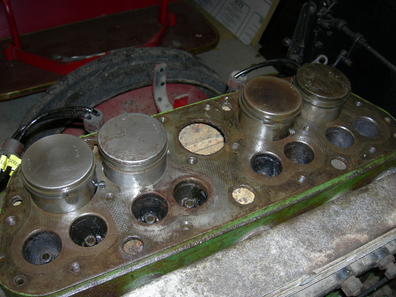 All the pistons are now free but still attached to their rods. The big end caps have been removed so that the pistons can be pulled clear of the bores so that the rings could be freed off.