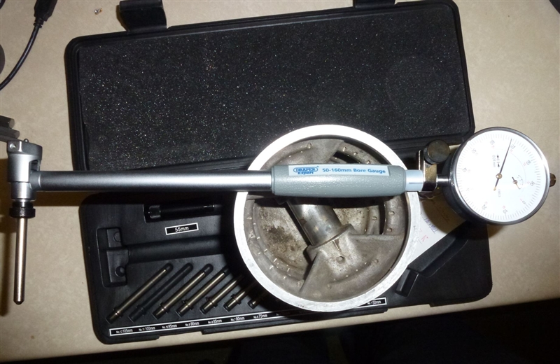 The problem being however was that a only a +040" replacement piston was not available when a +030" was required. It was decided to turn down the only available piston to the correct size. Before doing this an accurate assessment of bore size was required. to do this a bore gauge was used. Although bore gauges ae designed to be hand held a great deal of skill and experience are required to achieve repeatable and accurate measurements. A jig was therefore made to hold the bore gauge square to the bores. Bore gauges work in a subtractive mode. Rods are assembled in an additive mode to the next bore mm oversize (in this case 118mm) and the dial gauge records the amount to be subtracted. In this case the bore size is 116.66mm.
